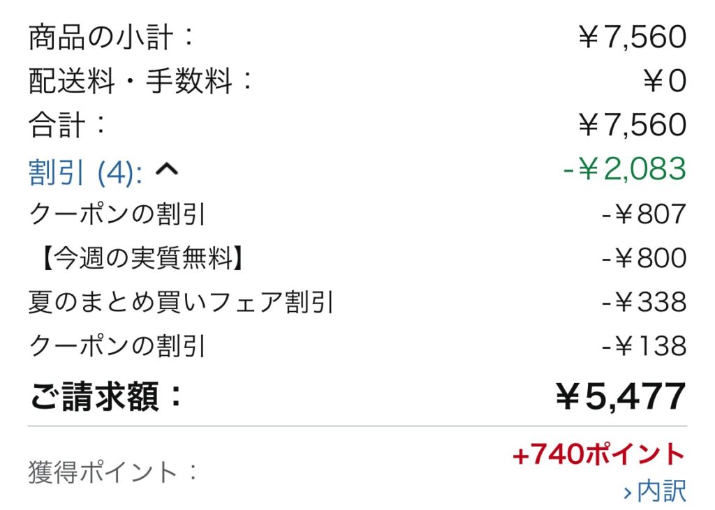 上記3点をカートに入れ購入すると通常Amazonポイント還元740ポイント、キャンペーン分のポイントが後日900ポイント還元されるので、実質3,837円で購入できます。