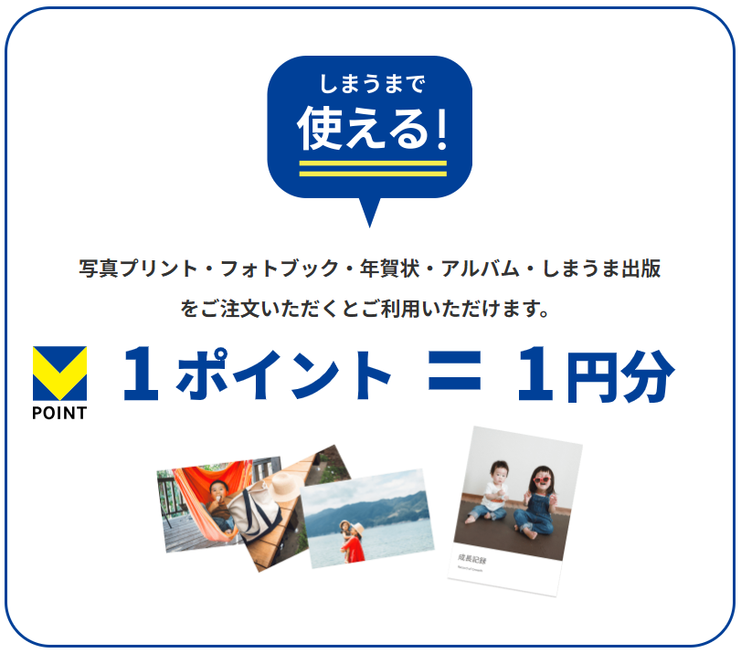 しまうまプリントで貯めたVポイントは、写真プリントやフォトブックなどの支払いに1ポイント=1円で利用できます。