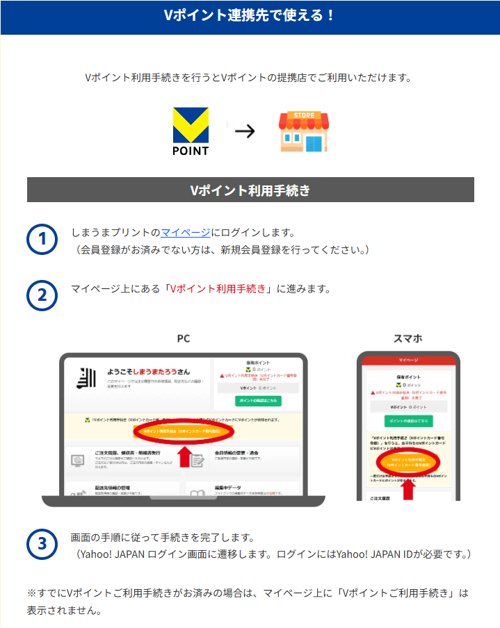 しまうまプリントでしか使えないVポイントなの?!それはちょっと使い勝手が・・と思った方ご安心ください!しまうまプリント以外でVポイントを利用したい場合には、Vポイント利用手続きを行えば利用可能です!