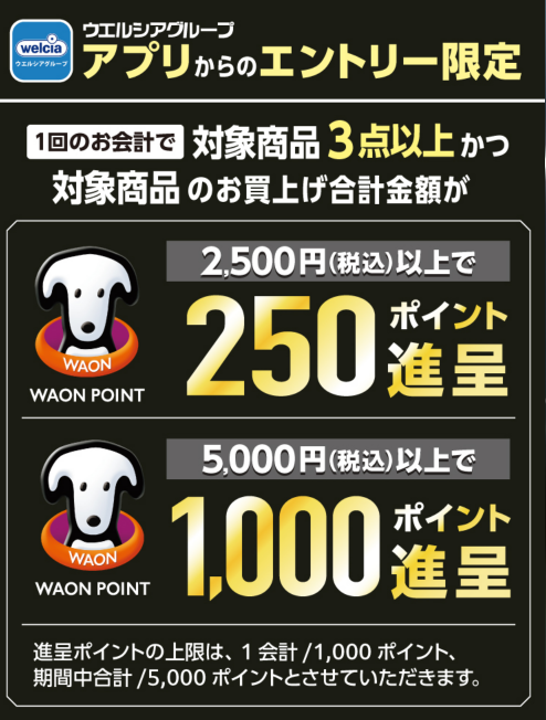 期間中に対象商品を購入して、ウエルシアアプリからエントリーすると、最大5,000WAON POINTがもらえるお得なキャンペーンです。