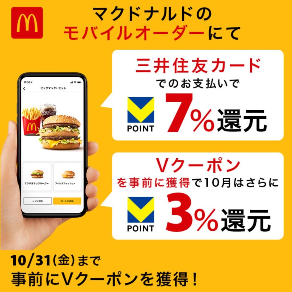 10月はマクドナルドでVクーポン+対象カードを使うと、
