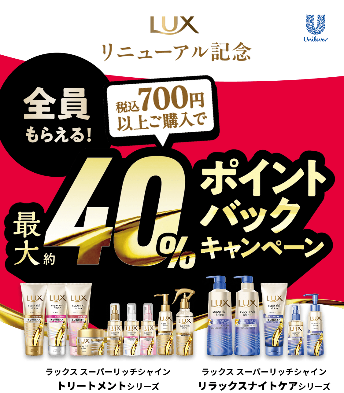 ラックスのスーパーリッチシャインシリーズで、対象商品を購入すると もれなく300円分の「えらべるPay」ポイントがもらえるキャンペーン が始まりました。
