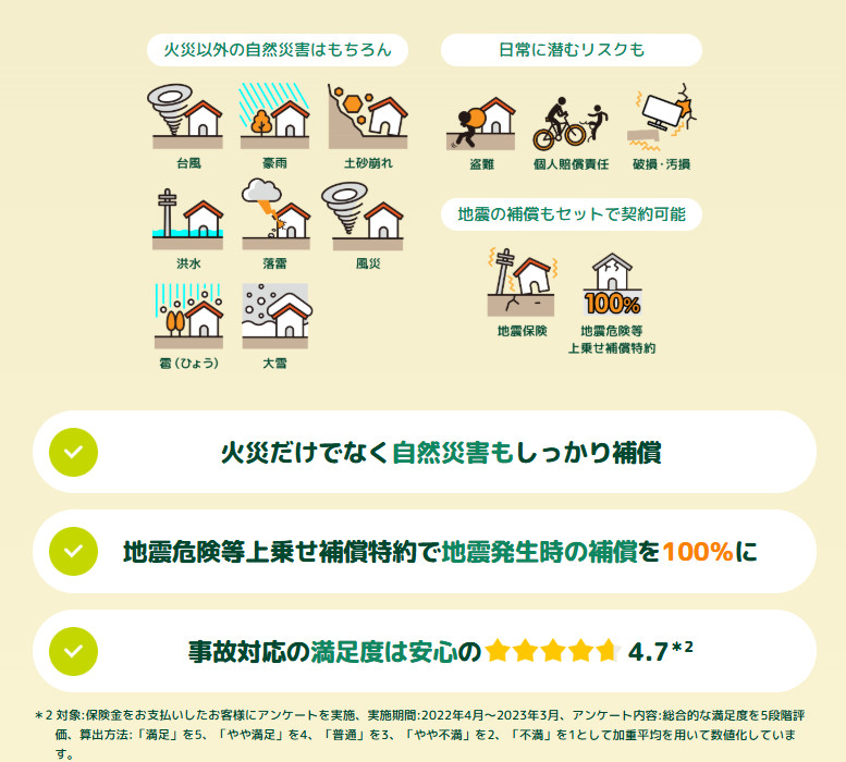 また、引受保険会社のジェイアイ傷害火災保険は事故対応満足度★4.7と高評価。トラブル時も安心して任せられます。