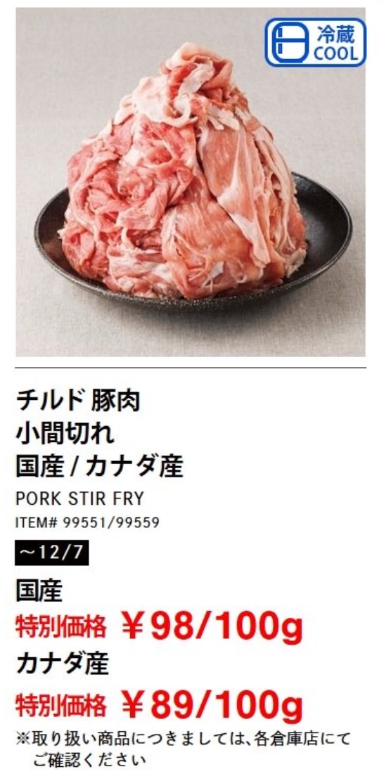 • 特別価格:国産:98円/100g カナダ産:89円/100g