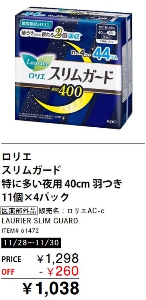 ロリエ スリムガード 特に多い日夜用 40cm羽付き 11個4パック