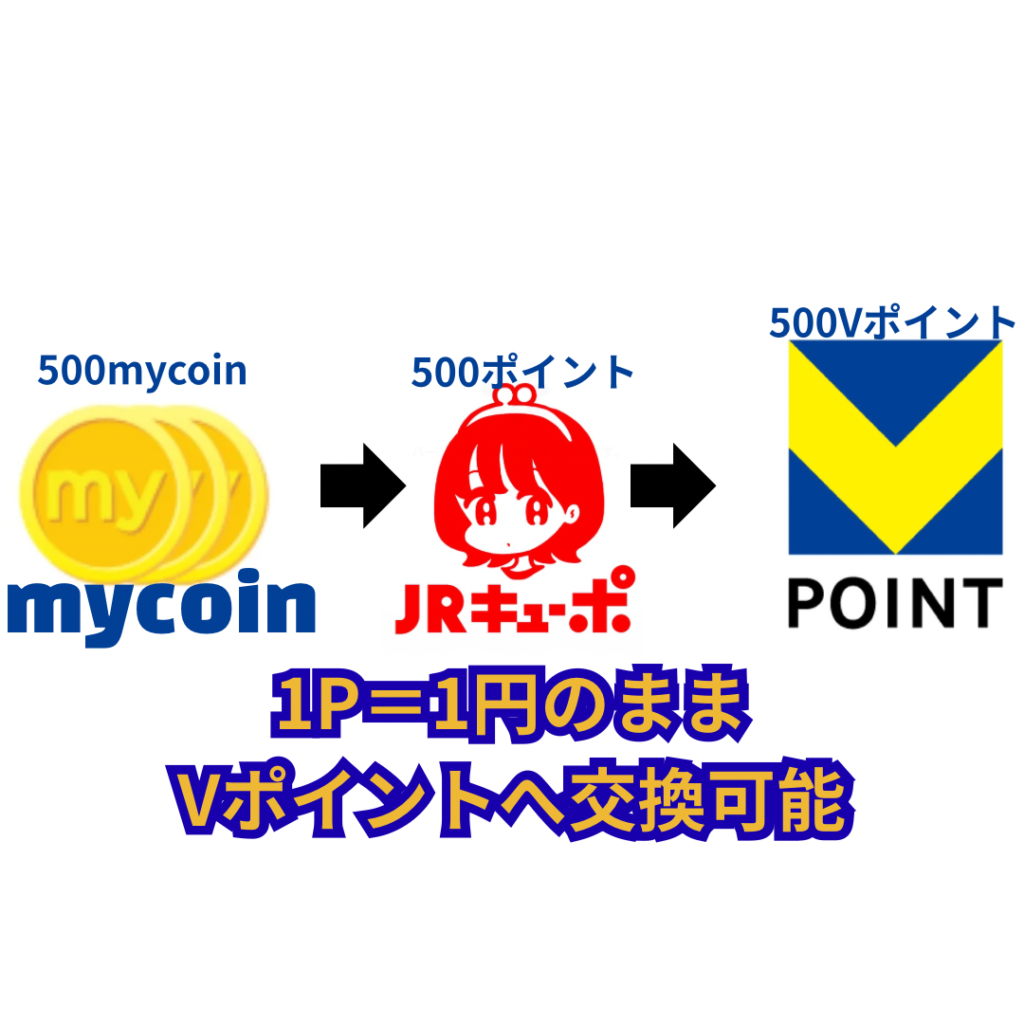 mycoinは、JRキューポを経由することでVポイントへ等価交換(1P=1P)が可能です。 直接Vポイントへ交換するとレートが下がってしまうため、 このルートを知っているかどうかで、ポイントの価値は大きく変わります。